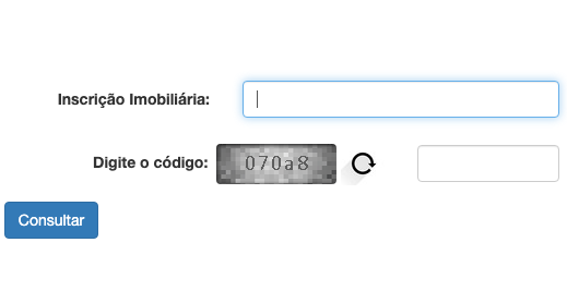 - Posteriormente, na página seguinte, basta informar a “Inscrição Imobiliária” do imóvel e o código solicitado, conforme imagem abaixo e clicar em “Consultar”.